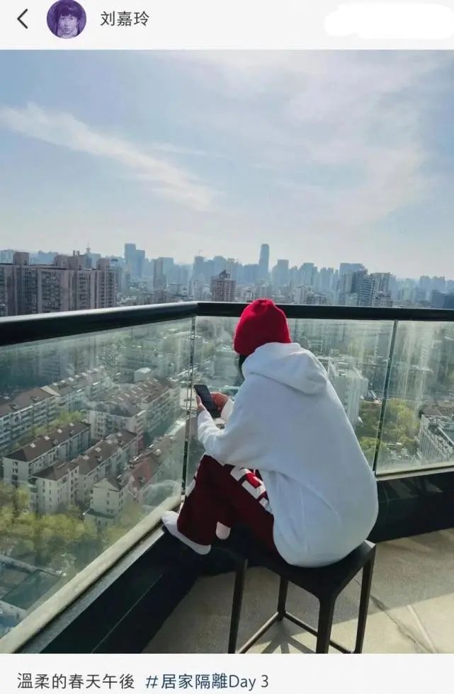 做完核酸后,刘嘉玲晒出了自己在阳台上玩手机的照片。照片中,只有刘嘉玲的背影,但网友们更关注的是这极其开阔的阳台。从阳台上看下去,上海的高楼尽收眼底。