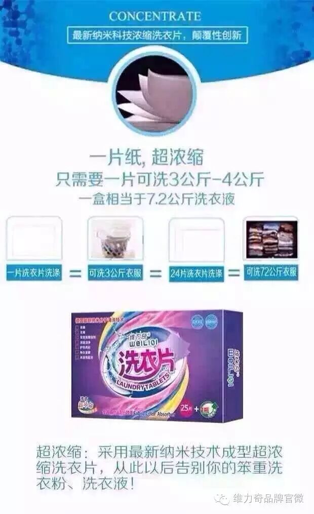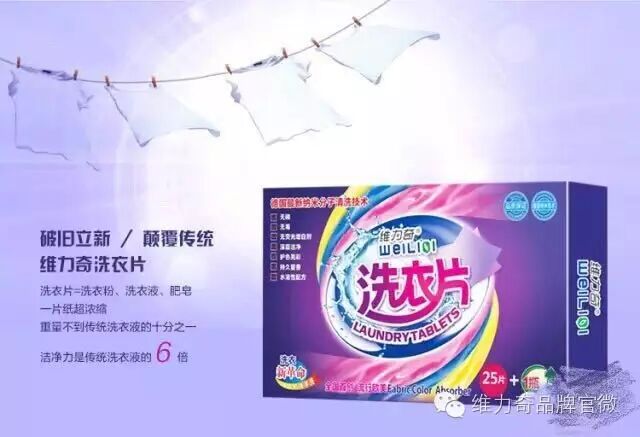 维力奇的诞生不仅仅是有了一个新的洗涤用品,更是一个时代的变化,是技术到达一个新高度时,一个更加优势的产品诞生在我们的面前,从洗衣皂被洗衣粉代替,洗衣粉被洗衣液代替,现在,洗衣液将被洗衣片代替,洗衣新方法已经来临!一个新的洗衣产业已经开始,洗衣片的优势是传统洗衣产品无可比拟的,不管是清洁上,健康上,环保上,价格上,效率上等等都远超传统洗涤产品!这也是为什么洗衣片一推出,就受到欧美国家的极力推崇!