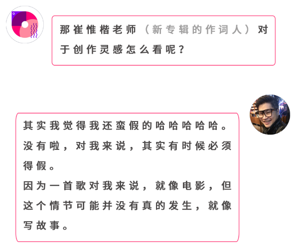 因为我很喜欢观察人事物,我很喜欢跟人聊天,毕竟歌是从人来的,很多时候灵感都是从人来的。