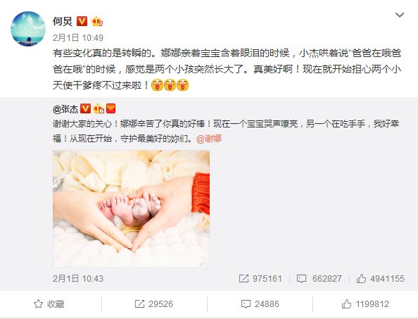 这对被催生了多年的明星夫妻,终于在“超级蓝血月”出没的这一天,迎来了自己生命中最珍贵的两颗小星星。