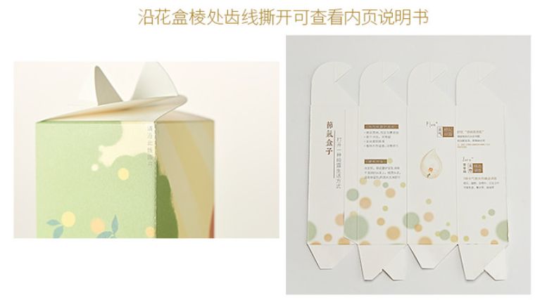 包装纸盒的设计也体现了环保和匠心,沿着盒子上的齿线撕开,就可以看到内页说明书。