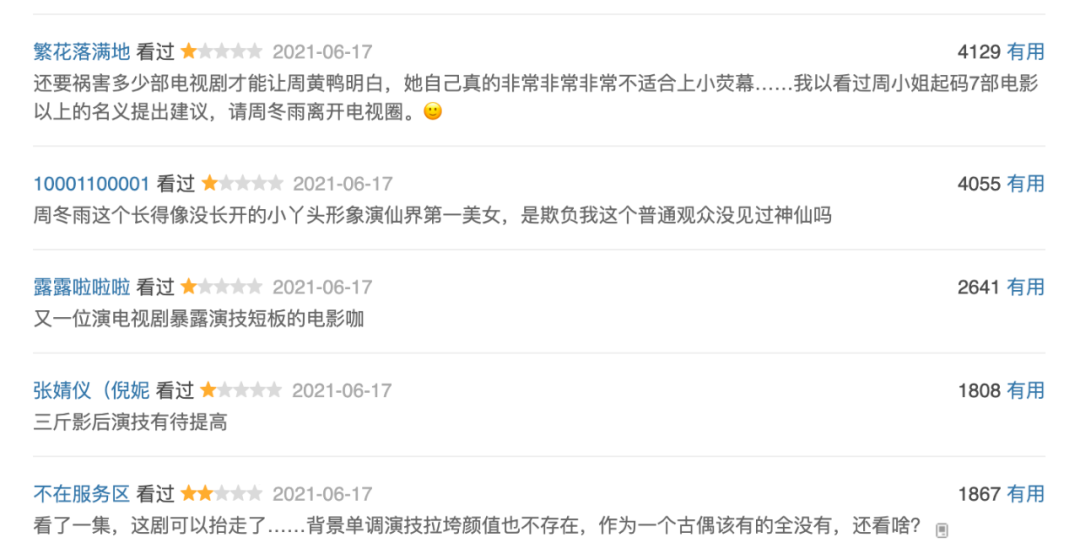 从这些评价中不难窥见,在不少观众心中,这部剧的最大败笔,恰恰是主演周冬雨本人。