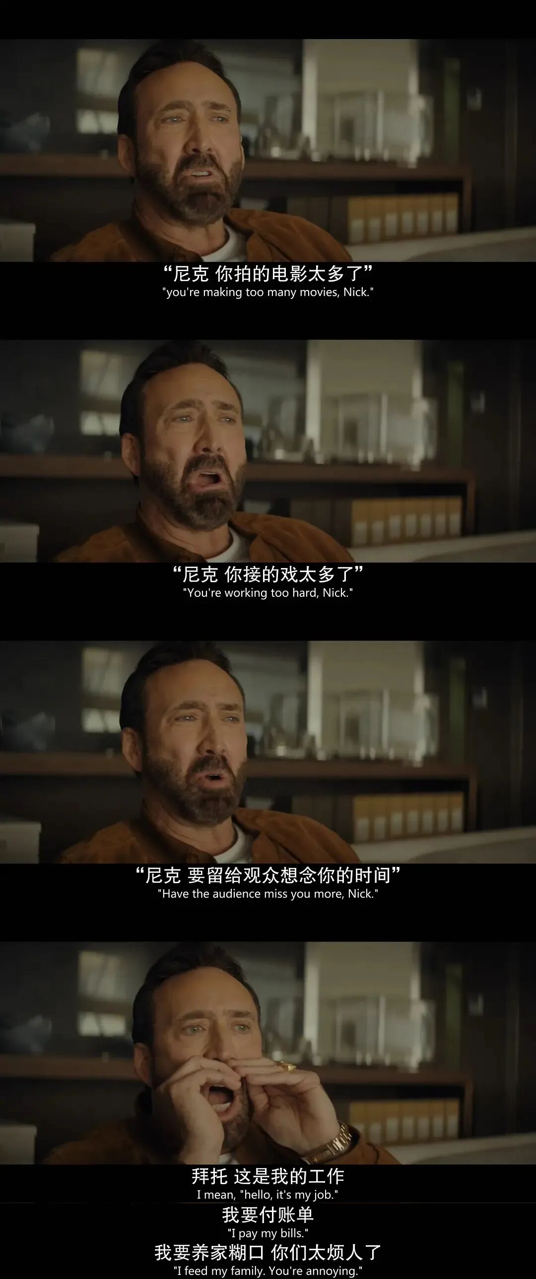 观众和制片人,加之凯奇自身的经济状况阻碍了凯奇本人的谢幕与转型,并将其变成一个90年代以来的B级僵尸,如果我们继续相信尼古拉斯·凯奇的银幕神话,相信他有朝一日会卷土重来,或是对于90年代的那些动作影片产生过多的情感的话,那么就像影片中被《帕丁顿熊2》感动的佩德罗·帕斯卡一样,成为另一部并不真诚的伪元电影的笑料。