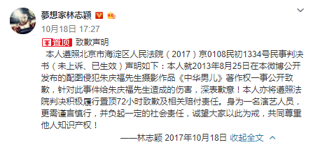 昨天林志颖按照判决结果,发布道歉微博并置顶三天。