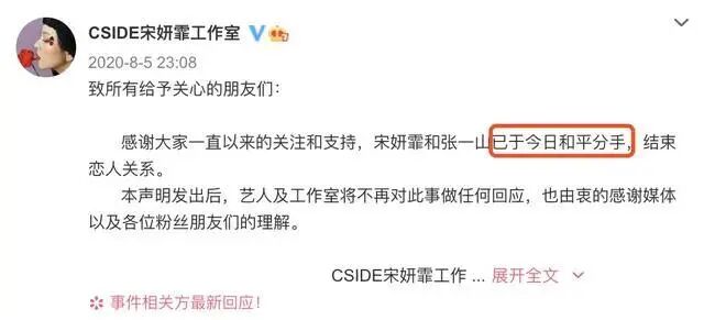 后来,宋妍霏单方面宣布,二人已经和平分手。这场恋情从曝光都结束也没有多久。