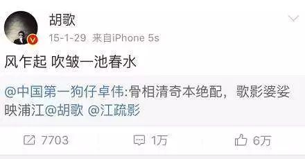 2015年,卓伟别有用心地做了一句诗“骨相清奇本绝配,歌影婆娑映浦江”,试图爆料胡歌与江疏影的恋情,还在微博上分别@了胡歌和江疏影。