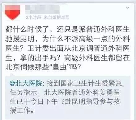昆明恐暴事件发生后,北大医院发出一则微博称:北大医院派出“普通外科医生”姜勇飞赴昆明参与救援工作。