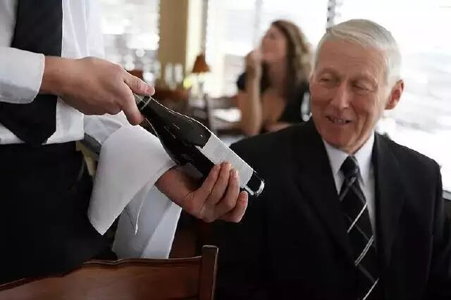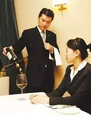 在开启葡萄酒前,侍酒师会将葡萄酒瓶放置在口布上,左手握住瓶身下方,右手握住瓶颈,将卷标朝上,保证客人能清楚地阅读酒标。而不是如乔菲这样,将葡萄酒的背面对着客人,就开始介绍这一款葡萄酒。