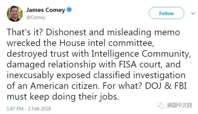 而早已被川普炒掉的FBI前局长科米 (James Comey)今天也对共和党开炮,说这份备忘录“不实且有误导性”,“破坏了与情报部门之间的互信,破坏了《外国情报监听法》,暴露了有关美国公民的绝密信息,这都是为了个什么?”他还给“通俄门”的调查打气说,“司法部和FBI必须继续坚持他们的工作”。