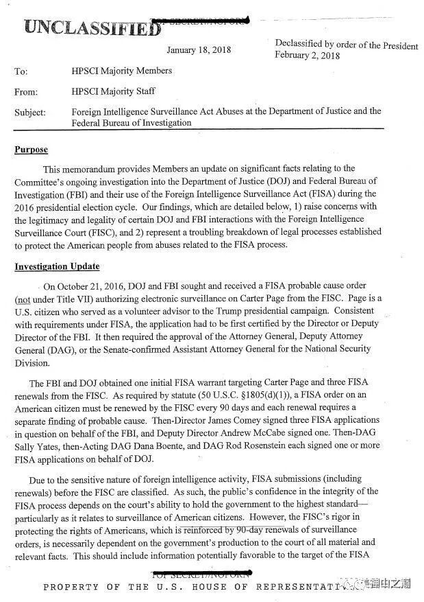 星期五,不顾司法部和FBI的反对,川普终于还是大手一挥,批准众院情报委员会公布了一份有关FBI和司法部调查俄罗斯干预美国大选(大家熟知的“通俄门”)的机密备忘录。被“通俄门”搞得不胜其烦的川普和共和党之所以要公布这份4页长的备忘录,自然是因为这对他们有利——里面记录了FBI和司法部滥用职权,取得监听一名川普前竞选顾问的授权的过程,以此表明,FBI和司法部在“通俄门”的调查里充满偏见和不法行为。