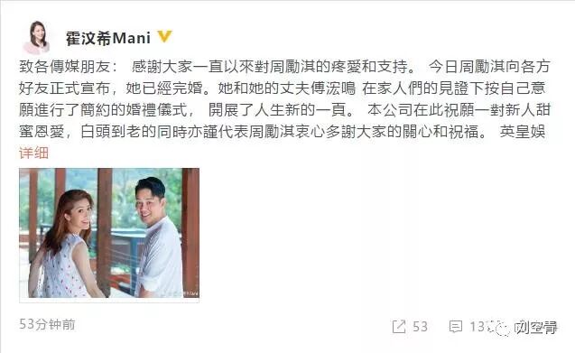所以,我们看到周丽淇姐姐和霍汶希一起突然说,周丽淇其实早在外国结婚啦!