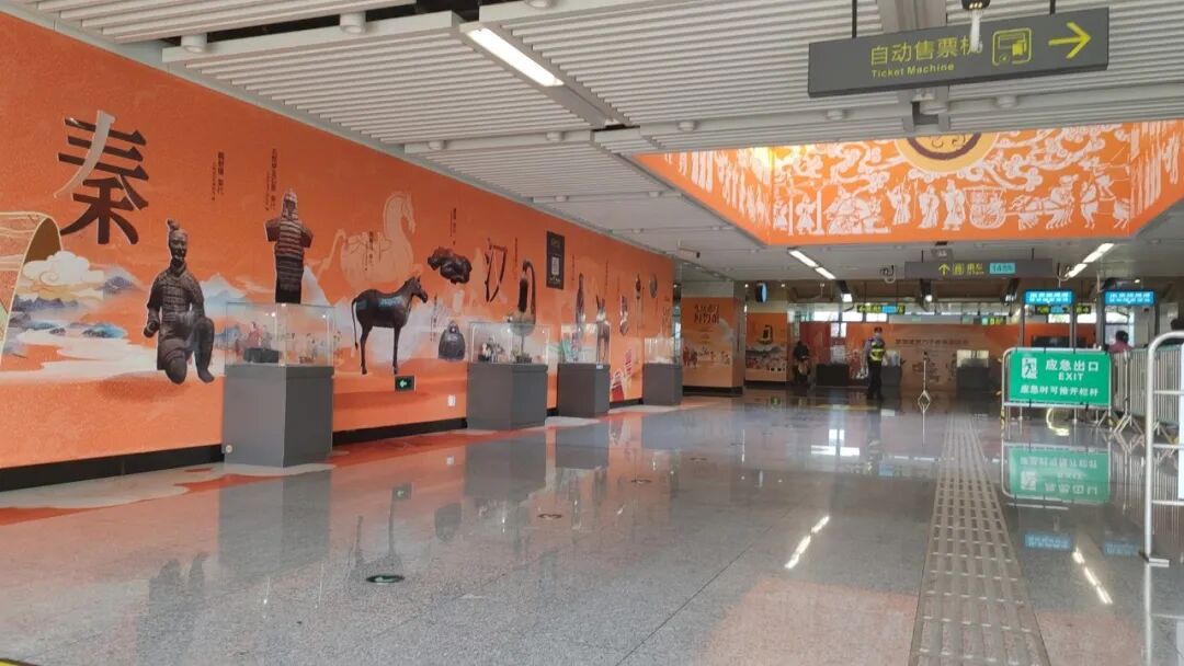 18日上午,在毗邻陕西历史博物馆秦汉馆的地铁14号线秦宫站,一场起舞跃动的快闪,犹如历史的序章,揭开“地铁遇见博物馆之秦风汉韵”序幕。站内,美陈展览、主题墙、包柱贴、灯箱海报,宛如历史长篇的画布,慢慢铺展着秦汉时期的壮丽画卷。步入展厅,一幅串联了秦汉代表性文物的画卷映入眼帘,生动展示了那个时代下丰富多姿的历史文化风貌,为观众带来全新的文化体验。特别是天井位置,四神兽和秦汉经典纹样与蓝天白云相互辉映,为观众营造出沉浸式的文化氛围。站厅层中心位置,2024国际博物馆日的主题展陈与陕西历史博物馆原创IP“秦威武”、“汉英俊”等文创形象交相辉映,生动展现了文化传承与创新的活力。