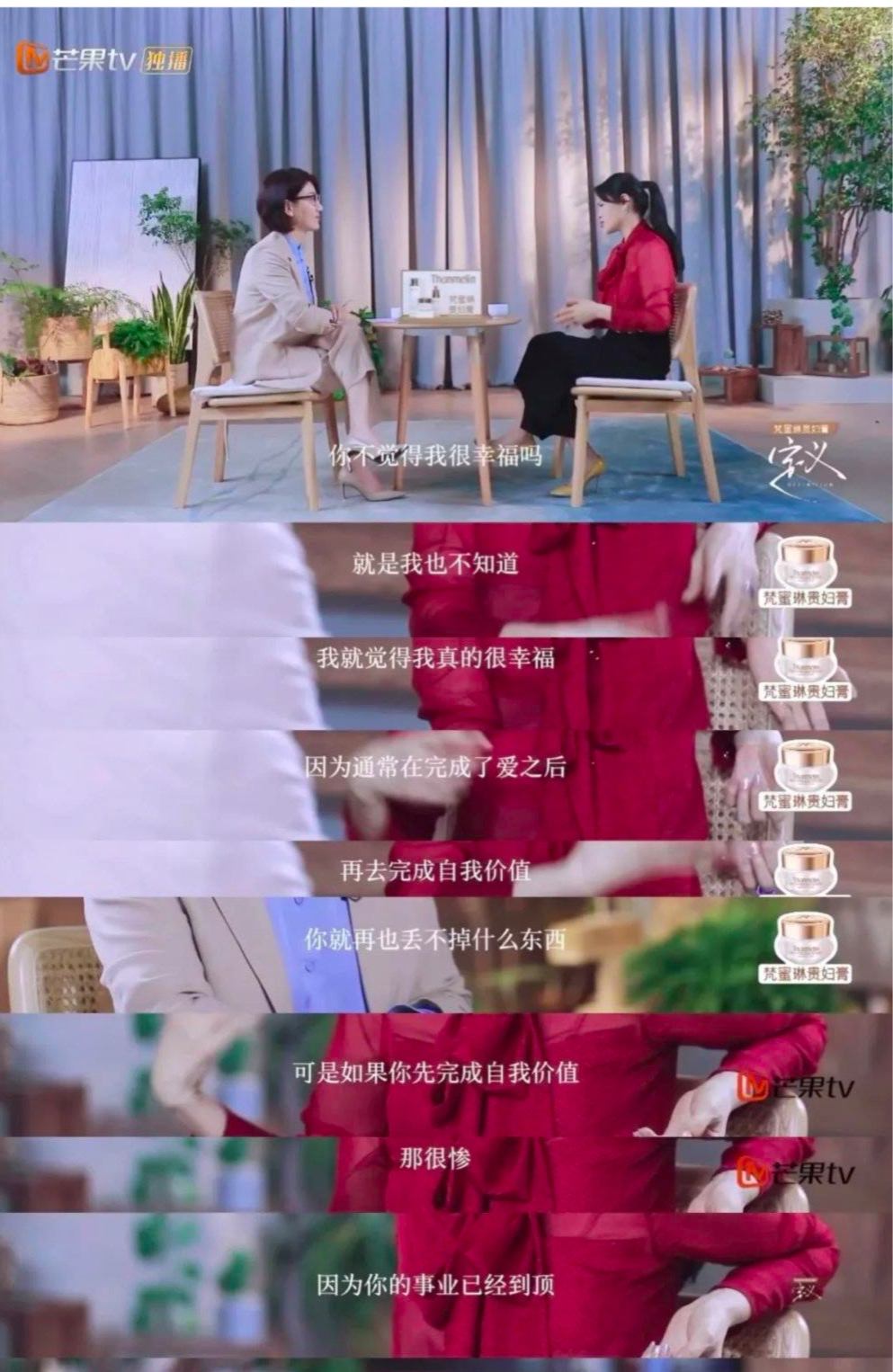 见对方没有回应,她补充道:“我就觉得我真的很幸福,因为通常在完成了爱之后,再去完成自我价值,你就再也丢不掉什么东西。可如果你先完成自我价值,那很惨,因为你的事业已经到顶。”