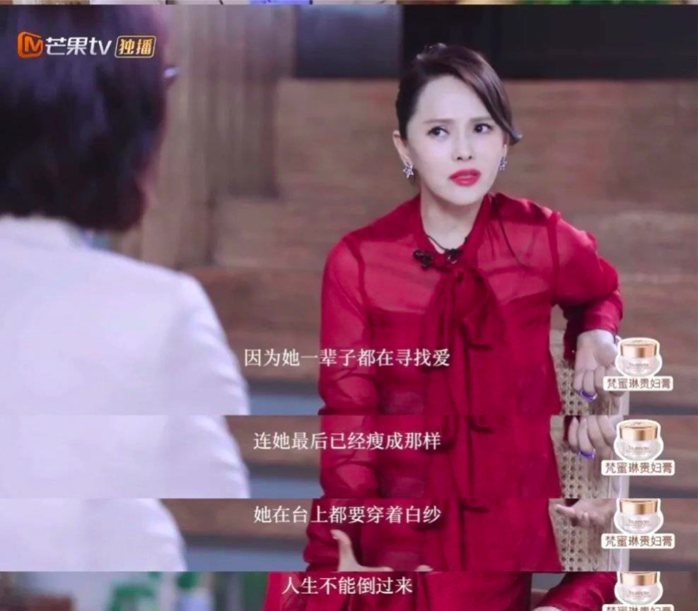 为了证明自己的幸福,她拉出已故多年的香港歌手梅艳芳,说:“那就会像梅艳芳,因为她一辈子都在寻找爱,连最后瘦成那样,在台上都要穿着白纱,人生不能倒过来。”