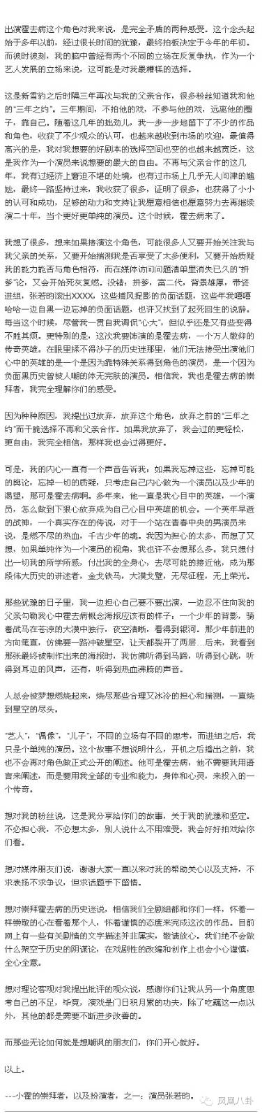 原来是因为最近张若昀要主演他爸爸执导的一部戏,为了回应网上关于“拼爹”的质疑,才发表了一篇发自肺腑的文章。