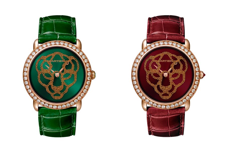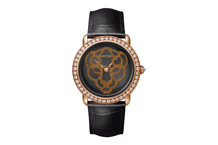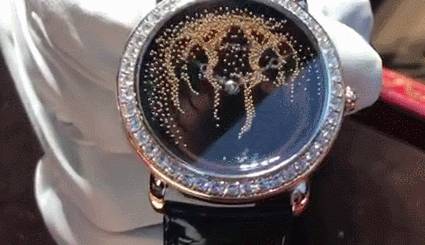 表面用到了卡地亚经典的猎豹元素,静态看外表已经够美了。但其实这块表自带gif 效果,表盘上的豹头是由900颗游动的金珠组成。