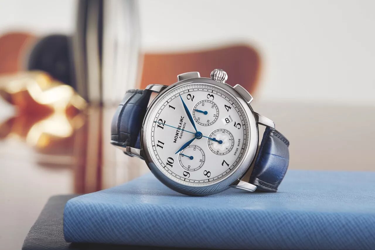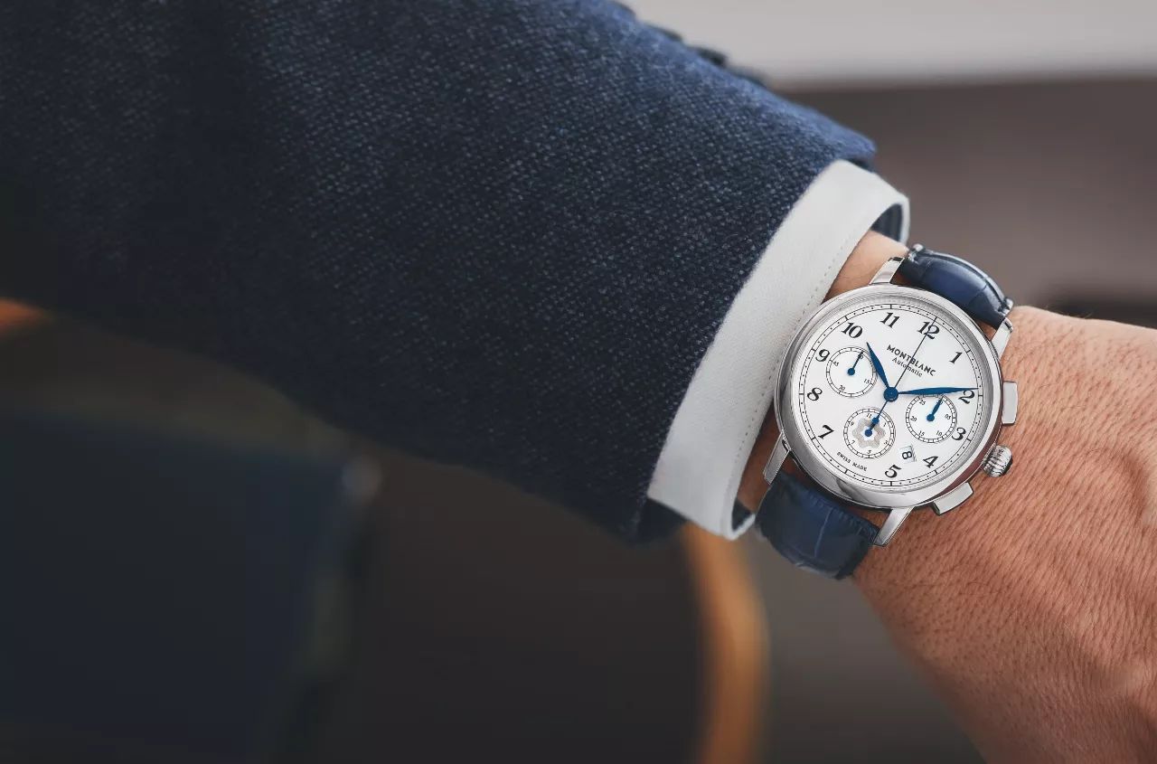 姐推荐万宝龙明星系列的自动计时码表,三个小计时窗口比简单表盘看起来更酷炫,30分钟和12小时计时盘,对于上班族来说,可以很好地作为时间管理辅助工具。