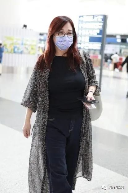 陈松伶出行穿一件时尚复古的长款黑底白点开衫,里面搭黑色内衬和牛仔喇叭裤,造型简约大方。脚上穿一双白色板鞋,肩背一个白色超大手提包,休闲穿搭轻松随性。