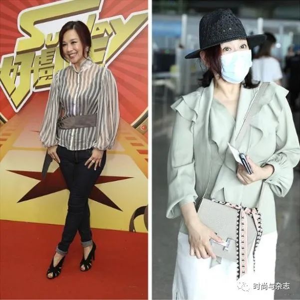 陈松伶身穿一件用荷叶边领口加灯笼袖设计的套头衫,颜色淡雅的衣服突显出淑女的优雅气质,展示温婉女性的魅力。