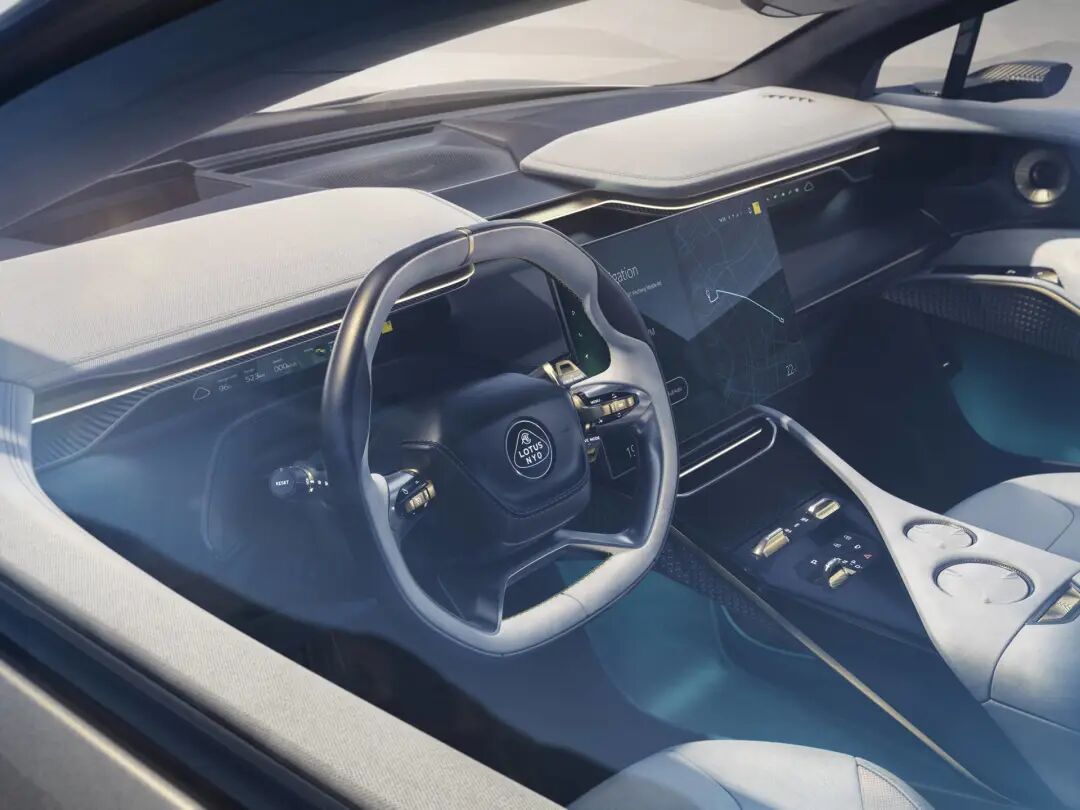 纯粹不止于外在锋芒,Eletre在内饰设计上也进一步延续“轻”的理念。轻盈羽翼主题造型的中部镂空仪表台,以及超薄显示屏和箭羽式空调出风口,包括回正标设计方向盘和风刃元素拨片,都继承了跑车的运动基因,简便轻巧,视觉效果上轻盈灵动,让驾驶者能够尽享与风共驭的畅快感。