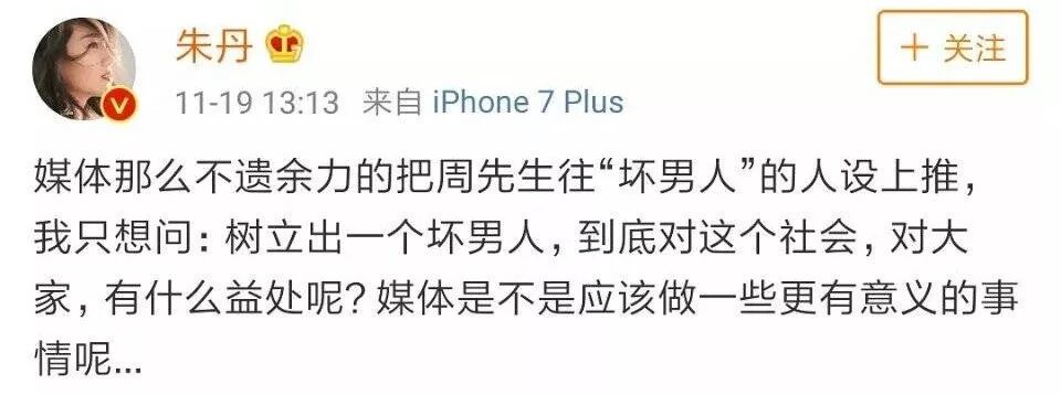 今天中午朱丹回应了:“媒体那么不遗余力的把周先生往“坏男人”的人设上推。。。” (现在已经删了)