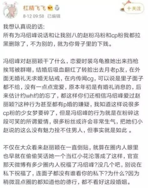 其实看完这几段话,觉得这位爆料者说的也不完全都是假的,冯绍峰和赵丽颖这段婚姻从一开始就不被网友看好,而且都在传两人是奉子成婚的,如果没有孩子