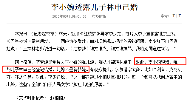 2010年,李小婉和李少红翻拍了新版的《红楼梦》。接受采访时,她透露了儿子林雨申已经登记结婚的消息。