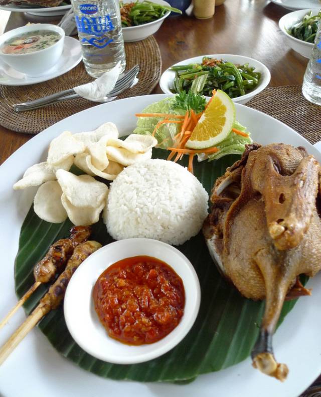 “脏鸭”是巴厘岛最有特色的一道菜,虽然名字不美丽,但味道绝对一流。Bebek Bengil餐厅的脏鸭是公认的NO、1,一定不要错过哟。吃之前淋上柠檬汁,鸭皮鸭肉都很滑嫩,咸味与印尼特有的香料味道共同作用在舌尖,味道真的棒!Bebek Bengil是真正的脏鸭餐厅,而不是中国代理经常带中国人去的那些。香酥可口!点了一份脏鸭餐,再加牛油果汁(强烈推荐)和木瓜汁,含税合90几元人民币,还是划算的~