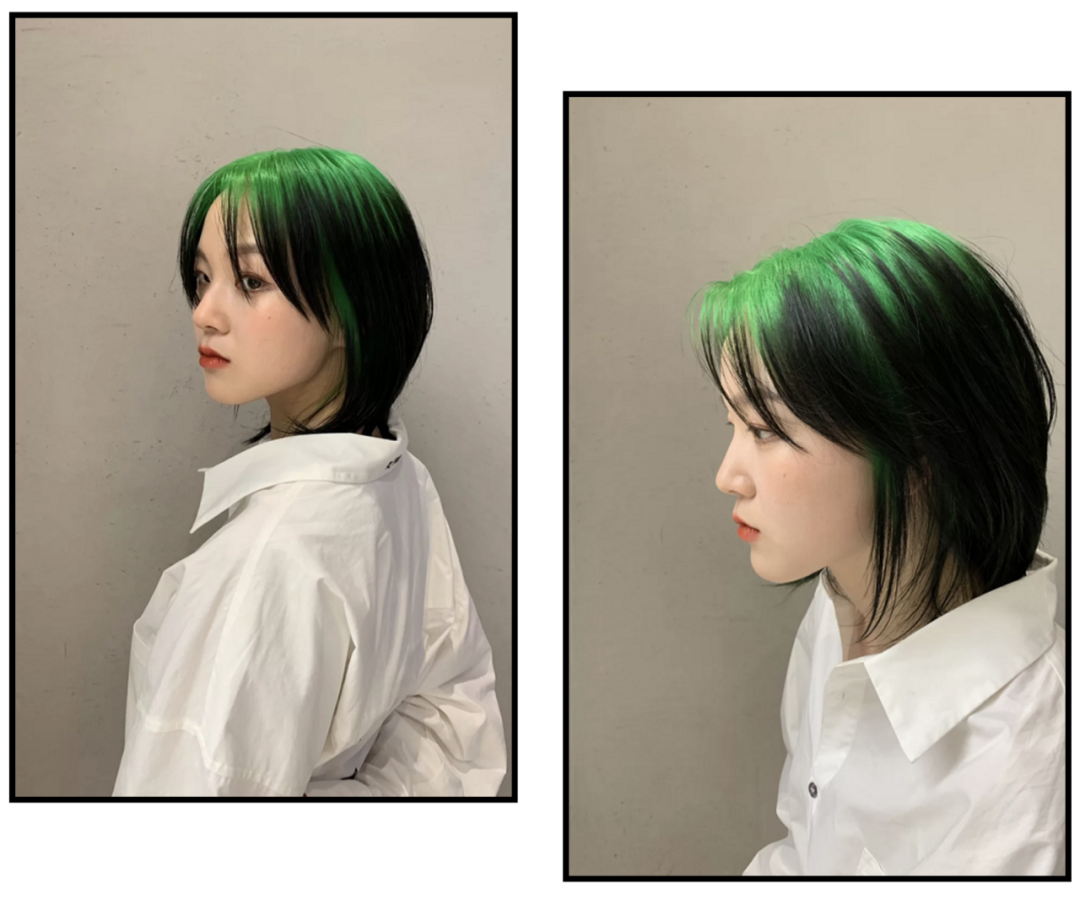 爆顶绿+顺滑黑发,利索率性,下一秒就能被邀请参加时装秀。
