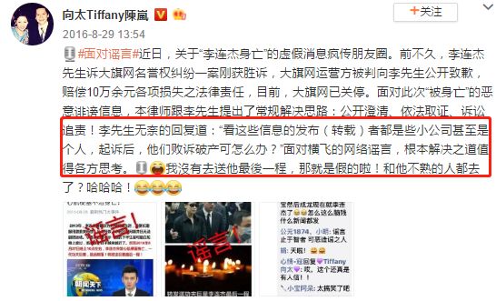 向太陈岚为了这事,专门发了一条辟谣的微博,还开玩笑地说:李连杰的追悼会她怎么可能会不去?