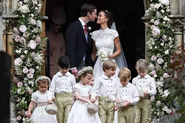 这么厉害的姐姐,当然是妹妹皮帕·米德尔顿的榜样咯。去年五月凯特王妃的妹妹皮帕和高帅富金融家James Matthew在英国伯克郡圣马可教堂完婚。这场婚礼的嘉宾可不是一般厉害,因为——半个英国皇室都到场来祝贺了,新娘的姐姐凯特王妃、姐夫威廉王子和哈里王子都盛装出席,乔治小王子和花童夏洛特小公主更是VVIP呢!
