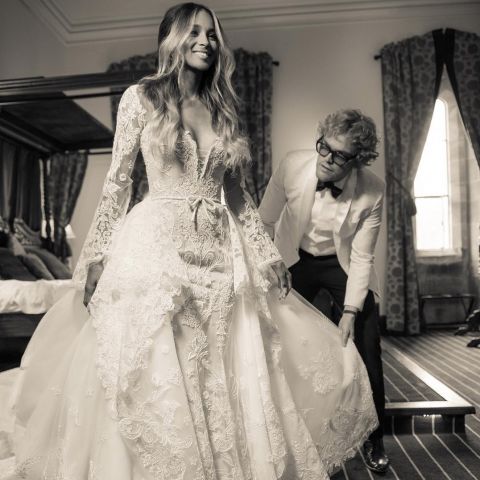 婚礼结束后新娘Ciara还在个人Instagram上发布了一张在设计师Peter Dundas陪同下试穿婚纱时的照片,脸上的笑容灿烂无比,宛如恋爱刚刚降临的少女一样。