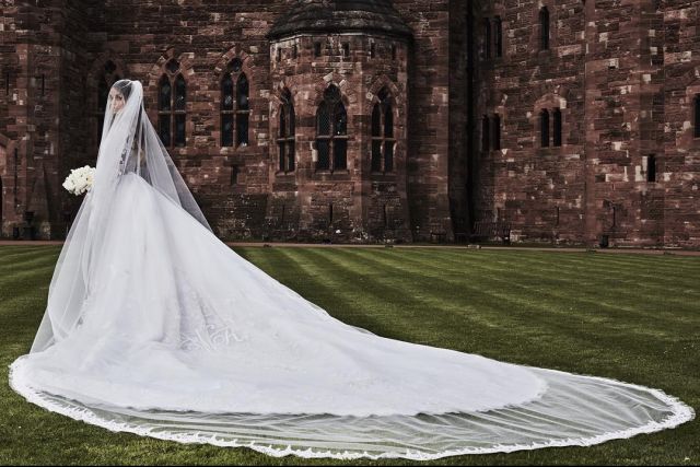 婚礼选在了北英格兰一个极美的中世纪古堡Peckforton城堡中举行。当年担任意大利品牌Roberto Cavalli创意总监的Peter Dundas特意为一对璧人设计华美的礼服。