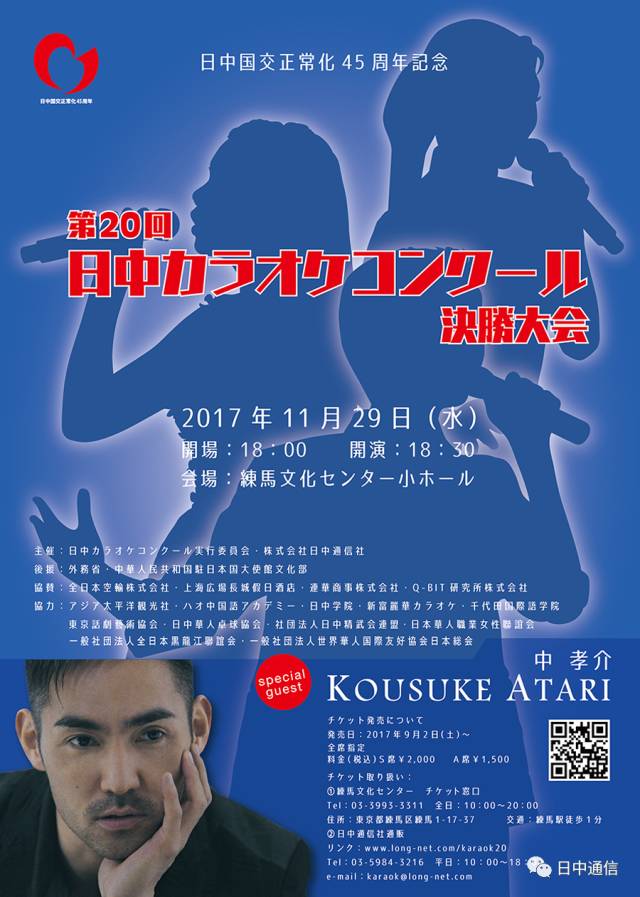 错过的粉丝们不要难过!11月29日,中孝介将作为第20届“日中卡拉OK大赛”的嘉宾,来现场演唱并和大家互动。(选手报名最后有链接)