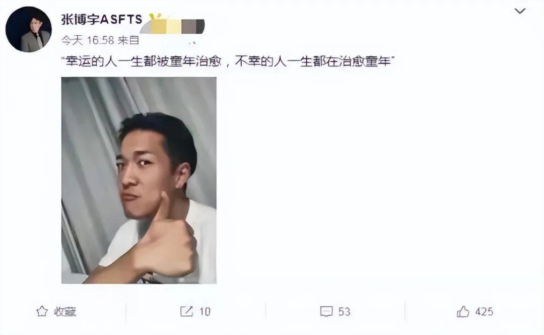 所以,在2020年的时候,在张丰毅公开对儿子表白:“儿子,我爱你”时,张博宇的反应才会如此冷淡,只说了一句“不幸的人一生都在治愈自己的童年。”