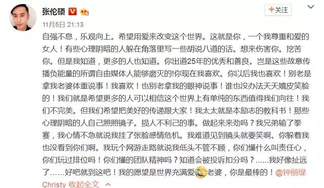 包括前段时间钟丽缇在微博上@了张伦硕,对方没有回应。就有很多网友觉得张伦硕不爱钟丽缇。