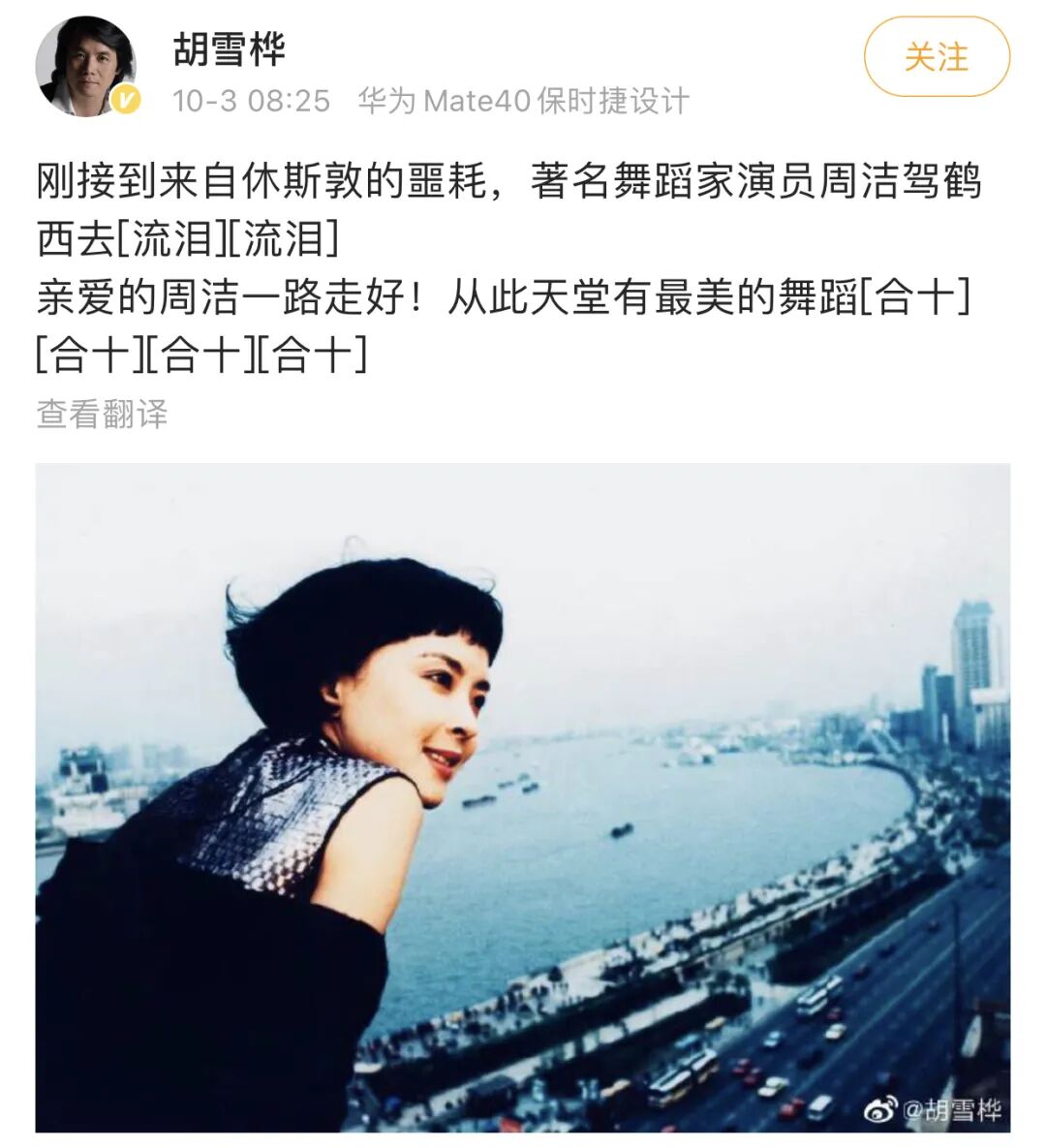 据悉,著名舞蹈家周洁辞世。