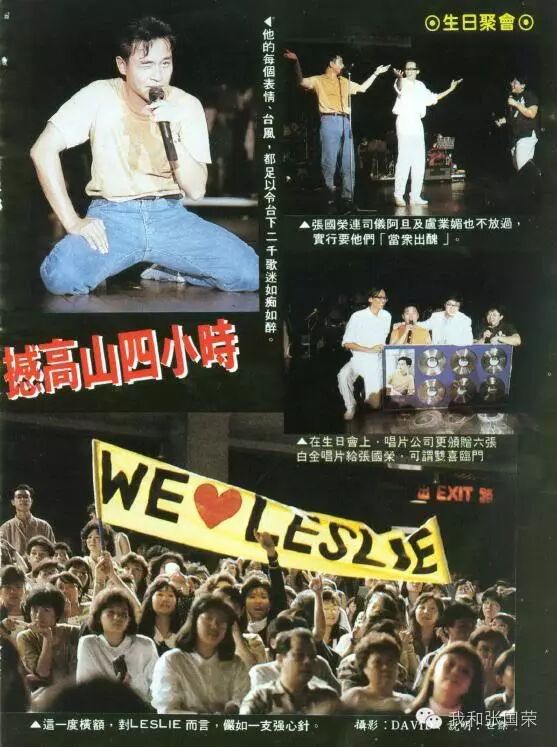 “Leslie,We love Leslie,Leslie……”,上月三十一日下午,在高山剧场里,约一千名歌迷热情高呼着,令整个高山剧场洋溢着温馨热闹气氛。 悉藉张国荣推出新唱片,且将近他九月十二日的生日,于是由重新改组后的张国荣歌迷会首次筹备今次以演唱会形式进行的盛大party,与歌迷们好好地聚会一次。由于Leslie有一段日子未与歌迷见面,所以今次聚会,fans们都表现得十分热情,故当Leslie唱medley时下台与他们握手时,因为他们过份热情,令Leslie无法走出人群与坐后排的fans握手,连Leslie也说:『咁迫,想同你地握手都唔得啦。』张国荣一连串唱了多首歌,在唱『无心睡眠』时,司仪卢业媚与阿旦被Leslie糟质一轮,要他们轮流跳舞,趣怪之情弄得Leslie fans也捧腹大笑。今次party,狄龙、朱宝意、陈山河均到来做嘉实,与Leslie一齐切蛋糕。此外,新艺宝唱片公司总经理陈小宝还即席颁了六张白金唱片给Leslie,大家都在一片愉快气氛下共同渡过这天公众假期。今次大家都玩得这么开心,故Leslie扬言十二月再开另一次fan club party,你们可要耐心等着呢!