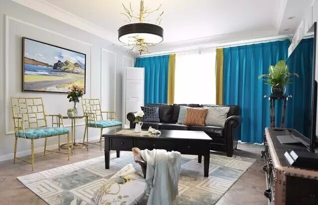 ▼客厅则是工业风与美式风格的混搭,粗糙不平的墙面带来很强的肌理感,是工业风装修中常见的墙面处理方式,蓝白两色的搭配也是直男感满满。美式斗柜配上复古的留声机,还有灰色的壁炉,呈现浪漫风情。现代风的沙发和可爱的抱枕搭配又有小男生的可爱,不得不说,这个空间真是亮点太多!