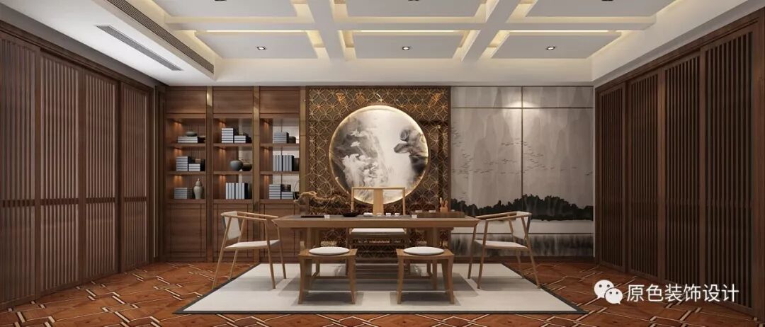 中式实木茶桌、以及阵列的木条,营造出一个有着丰富的层次和拥有私密感的书房。