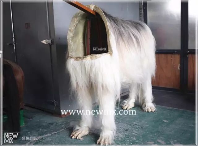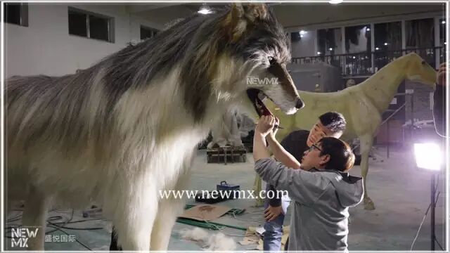 巨狼的毛发为达到真实动物的毛发质感,从毛发的选材及质感上就很细致,毛发长短不一,粗细不同,颜色细致,加上手工上毛,使得巨狼全身上的毛发真实感极高。