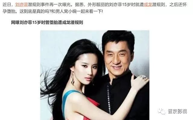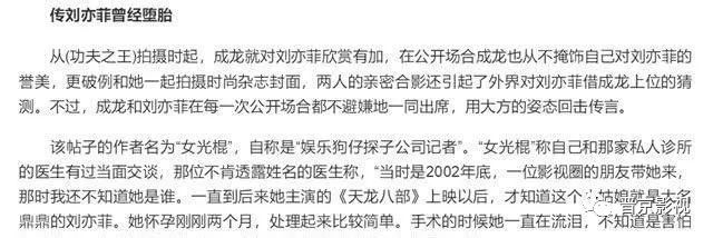 爆料称刘亦菲在自己15岁的时候为成龙打过胎。原来有诊所的医生出来爆料称当时刘亦菲找到自己的时候刚怀孕2个多月,手术非常的简单也非常的成功,刘亦菲当时因为年纪小所以一直在哭。医生也表示当年《天龙八部》还没有播出,所以自己根本不知道刘亦菲是谁,更不知道她将来会是一个大明星。