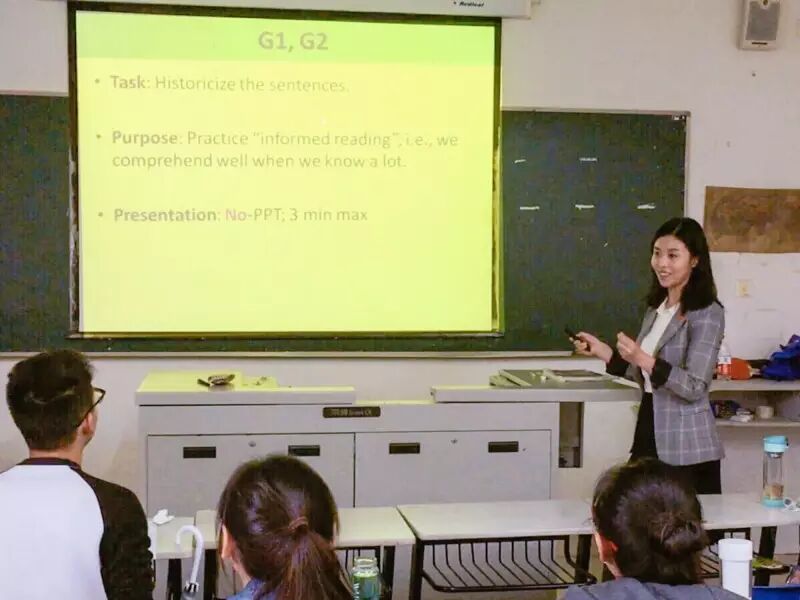 关于“输出”,王睿老师从两个层面给出了她的理解:其一是表达能力。“对所有的语言专业学生而言,学习的重点应包括如何把知识语言化、外化。”为此,国教学院进行了课程设计,在课堂上强化演讲等方面的训练,希望以此弥补学生在表达方面的欠缺。其二则是思辨能力。王睿老师深知,学生和社会的持续发展都离不开“软技能”的滋养,其中思辨能力尤为重要。同时,她也注意到学生在学习中仍习惯于寻找“正确的知识”,而缺乏批判性思维这一现象。于是,她便在教学设计中增加了思辨训练任务,以增强学生的逻辑和思维的严谨性。比如,在《高级英语》课文中有这样一段文字:“爱因斯坦在雨中保护帽子而不是头发,体现出完美的推理思维”。她就请同学们将这句话暗含的逻辑过程用三段论写出,并讨论这个论证的薄弱之处。在培养学生思辨能力的同时,王睿老师还不忘提醒他们:在擅长批判的同时,更要对他人的思想抱有尊重和欣赏。