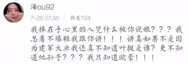 这番言论,自然引起了欧豪粉丝的不满。其中,有个粉丝就怒怼说,“如果不是因为建军大业,我还真不知道叶挺是谁!我只知道欧豪!”