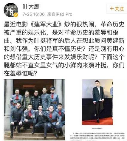 近期,电影《建军大业》正在上映。因为影片中叶挺的扮演者是“小鲜肉”欧豪,引发了革命先辈叶挺后人叶大鹰在微博发飙,声称“找这个女里女气的小鲜肉演叶挺,这是在羞辱谁呢?”