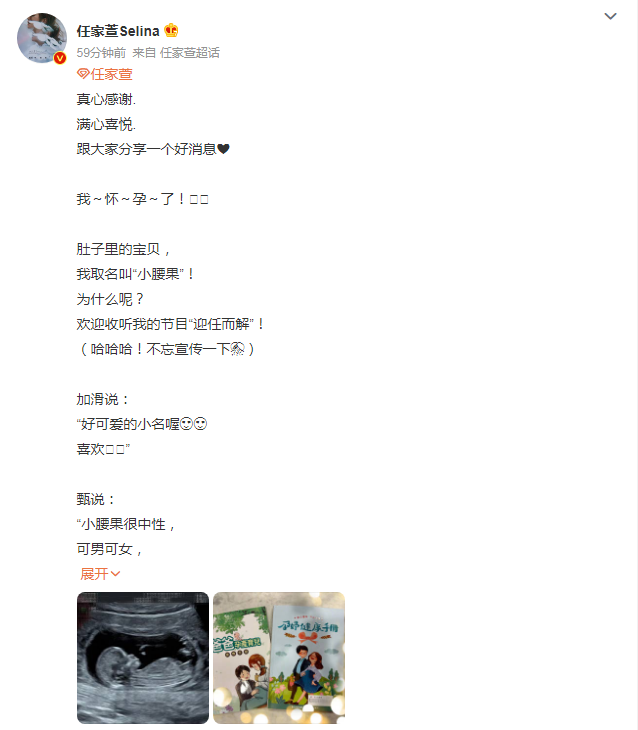 3月13日,SHE组合成员Selina(任家萱),晒出B超照,宣布自己怀孕的喜讯。
