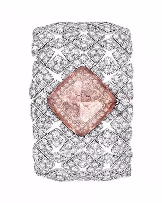 Chanel 在今年的 Baselworld 上推出的山茶花高级珠宝腕表,镶嵌着近45克拉白色钻石,组成三朵山茶花的造型。推动表盘下方的山茶花,右侧半掩着的山茶花将缓缓移开,由长方形钻石镶嵌而成的表盘便呈现在眼前。