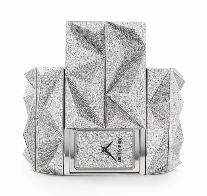 Audemars Piguet 在今年的 SIHH 上推出了这枚满钻珠宝表,以利落简洁的几何线条勾勒出腕表的轮廓,56个铆钉式排列的金字塔形刻面塑造出立体感,雪花镶嵌8148颗钻石,推开表盘上的滑盖便可以读到时间。