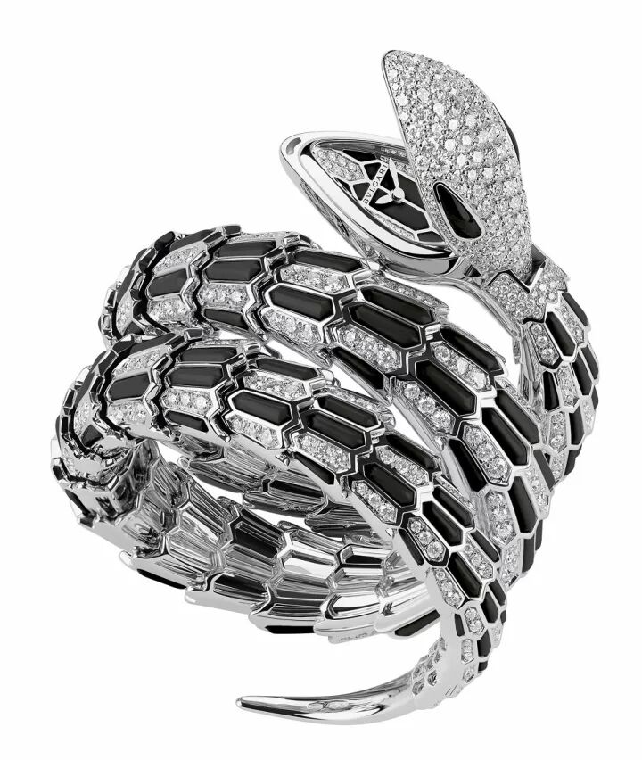 Bulgari 在2014年的巴黎古董双年展中带来了这枚「Bulgari Serpenti」隐秘腕表,沿用了最具代表性的蛇形设计,白金表链采用了铰接结构,镶嵌明亮式切割钻石和缟玛瑙。细巧的表盘隐藏在蛇的头部,宝石装饰与表链相得益彰。