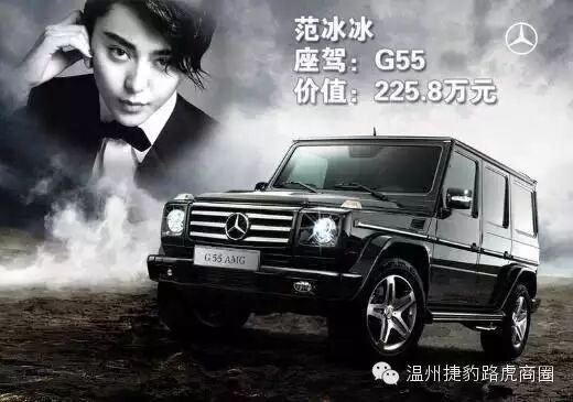 范冰冰范爷的座驾,自从走爷们范儿之后,范冰冰的人气和霸气都处于极度升温中。因此奔驰G55 AMG和她很搭。